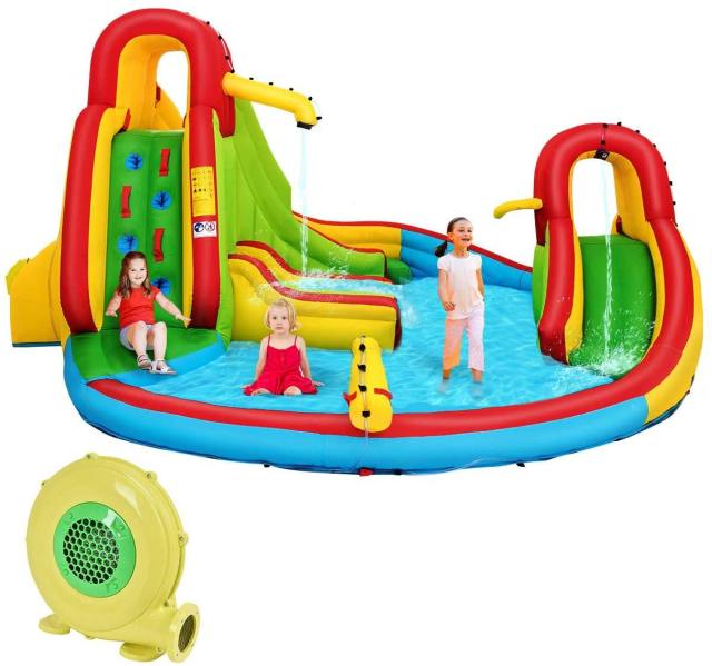 - 6-in-1 Endless Fun in Cool Summer: Specially designed in offering kids various activities, the inflatable water slide allows kids to enjoy the exciting water slide, climbing, shooting, football match, water playing, and water gun battles with friends, bringing them a cool summer. It is suitable for 3 kids to play together in the inflatable part. (Suggestion: every kid's weight should be under 66 lb. Does not include the splash pool part) Recommended for 3-12 years old.