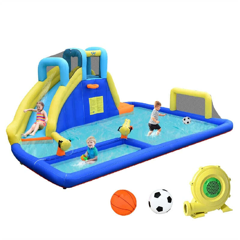 Bring kids an exciting and cool summer with the 6-in-1 inflatable water park. Designed with a waterproof feature and equipped with a water pipe, it will be ideal for the summer party. 2 built-in water guns add more fun to the water battle, getting rid of the heat of summer. Apart from water play, kids can also enjoy sliding, climbing, and playing basketball & football. What's more, thickened oxford material ensures high durability for a carefree playing environment.