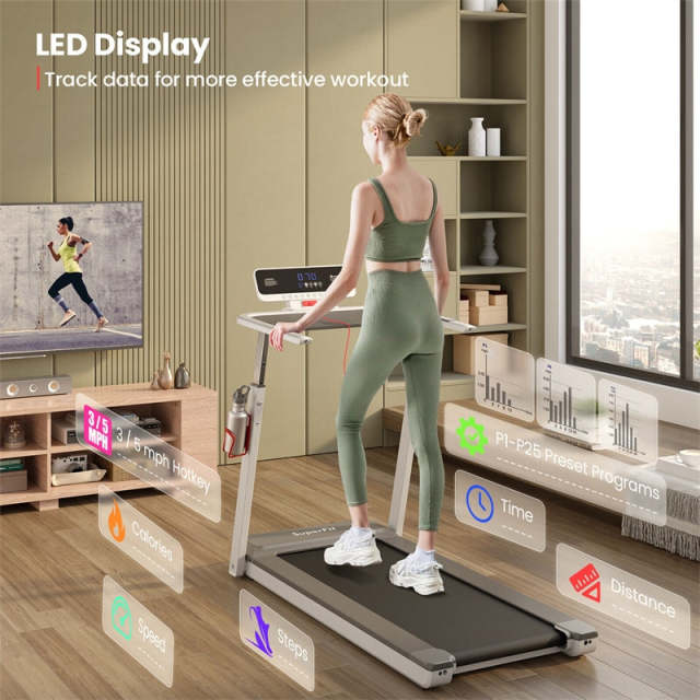 3HP Folding Treadmill w/Desk, Adjustable Height, APP Control, LED Display & 25 Preset Programs, Compact Walking Running Machine for Home Office