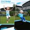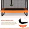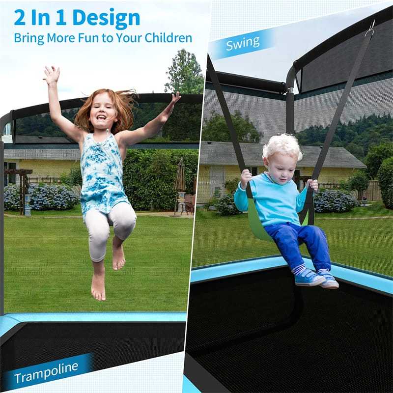 This is a 2 in 1 trampoline and swing combo with safety enclosure net that can give children a good bounce experience with security. Combining trampoline and swing as one, this kids toy set supplies your child with a choice to jump and swing. If your kid wants to jump, the high-density jumping mat with 40 premium springs will offer an excellent bouncing experience. And the U-shaped galvanized steel frame is sturdy enough to support your child (220 lbs for trampoline and 110 lbs for swing). Meanwhile, the soft foam cushion and upper pipes with foam padded keep your kid safe.