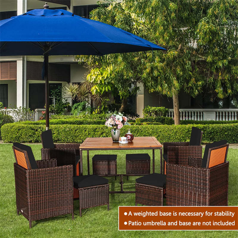 9-Piece Acacia Wood Rattan Patio Dining Set w/Cushioned Chairs, Ottomans & Umbrella Hole, Space Saving Outdoor Furniture for Backyard Garden