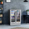 This 2-in-1 dual-zone wine and beverage cooler can keep all your drinks at the right temperature! The dual-zone wine and beverage cooler achieves independent digital control in 2 zones--beverage section temps of 50 °F to 35 °F and wine zone of 41 °F to 64 °F. Meanwhile, it easily contains up to 18 standard wine bottles and 57 cans of sodas. And the clear double tempered glass doors not only block the harmful sunlight for radiation protection, heat preservation, heat insulation, and anti-condensation but also keep the full view. Moreover, the fan-forced circulation air cooling system colds air in every corner, equalizing the temperature of every bottle of wine and drink. What's more, this wine fridge cooler is also equipped with a carbon filter to reduce bad smell, auto-defrost for high efficiency, and a quality low-vibration compressor. Other than that, there are removable shelves (steel rack for beverage x 3, beech rack for wine x 4) with anti-tipping stoppers and raised edges, which will prevent slipping and enable use for most of the rooms.