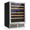 The 24" dual zone wine cooler is a perfect gift for wine lovers! This wine beverage comes with 2 cooling zones, the upper offers an adjustable temp of 40-55°F & the lower allows an adjustable temp of 55-65°F. You can set a desired temperature with the LED control panel, while it can turn on the LED lights and set the temp unit as well. Plus, the mini wine fridge with safety lock has 6 beech wood shelves for 51 standard Bordeaux bottles. The stainless steel overall frame is well-sealed to insulate heat, while its 2-tier tempered glass door resists UV rays. The wine refrigerator also has a scientific charcoal filtration design, which can eliminate odors and ensure air purity. Featuring a strong compressor, the DOE-certified wine cooler ensures quiet running and less vibration. Depending on your needs, it can be installed independently or built into cabinets or under counters. Besides, its reversible door allows for right or left installation to adapt to actual space while its adjustable foot pads keep the whole wine fridge stable.