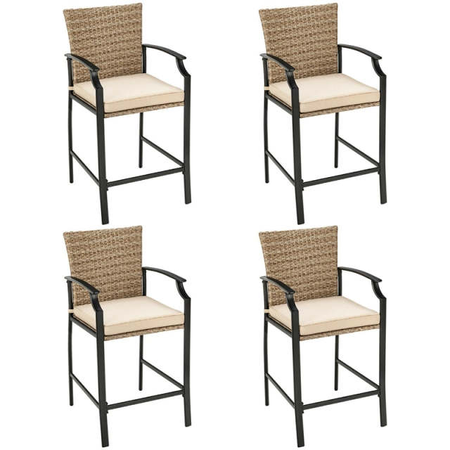 This patio wicker rattan barstool set of 2 can provide you with cozy relaxing experiences on outdoor occasions. Designed with ergonomic backrests and armrests, the patio bar height chairs will relieve your fatigue for your comfort. And the soft seat cushions add more coziness. Also, each barstool is extremely sturdy to withstand 400 lbs heavyweight with a reinforced metal structure. The metal frame is also rustproof for prolonged service life. Other than that, the wicker PE rattan surface not only endows it with a piece of elegance but also fits for patio use. Come and get these cozy barstools for your outdoor relaxation!