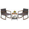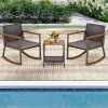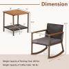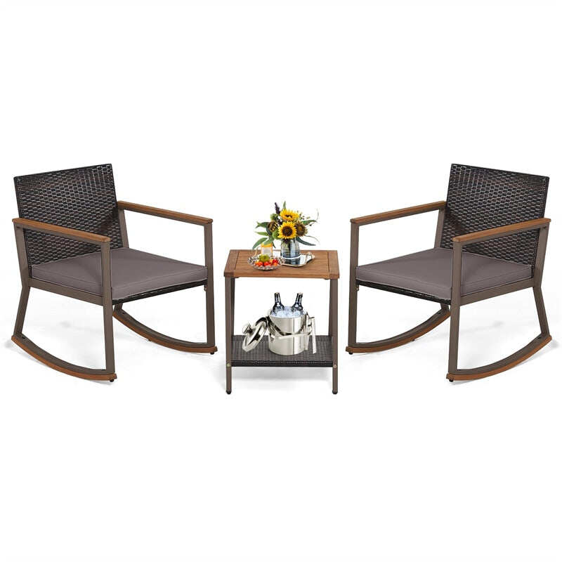 Create a relaxing outdoor seating zone you've always dreamed of with our 3-piece rocking bistro set! Including 2 rocking chairs, 2 seat cushions, and 1 storage coffee table, this patio rocking conversation set will be a perfect addition to your indoor or outdoor settings. The outdoor rocking chair with soft cushions rocks back and forth smoothly, easily taking your whole day’s tiredness away. And, the coffee table comes with an extra storage shelf to keep items at hand. Made of sturdy metal frame, durable rattan PE rattan, and natural acacia wood, the outdoor furniture set will ensure a longer service life. You can place this rocking bistro set on your porch, poolside, or balcony to enjoy the morning coffee and pleasant chat with your friend or family!