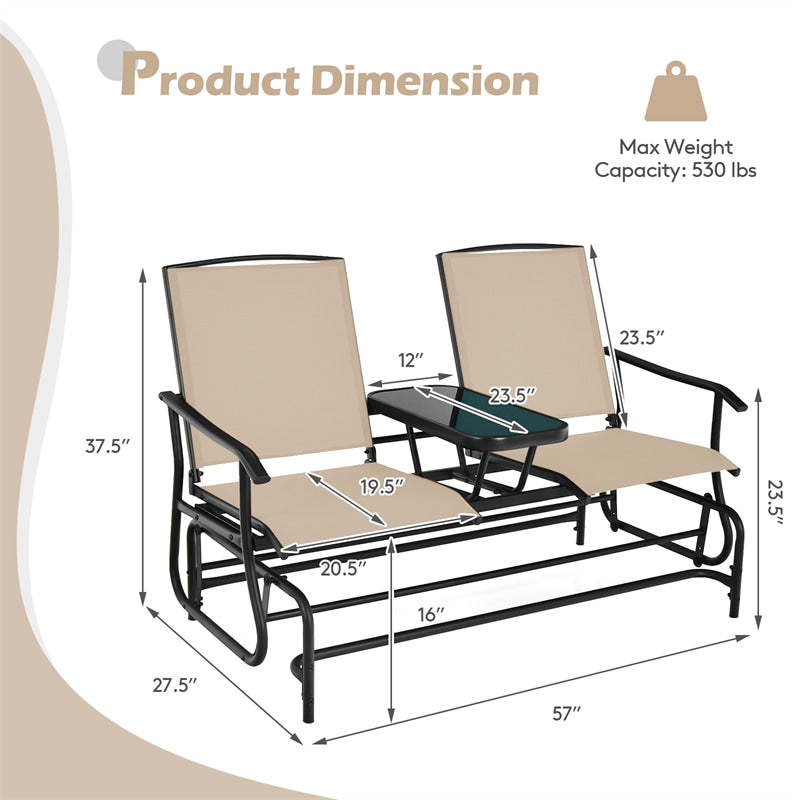 The sturdy double glider chair with a center tempered glass table could not only bring you the most comfortable rocking experience but also add color to your outdoor living space with an ergonomic design. The 2-person rocking chair adopts a solid steel frame, which is durable with a load capacity of up to 530 lbs. And the tabletop in the middle of the seat is made of tempered glass, which is beautiful and can be used to put food or decorations on. Meanwhile, the armrests on each side of the glider loveseat are ergonomically designed to relax your arms and hands. Thus, you can sit on the outdoor rocking bench with your family or friends and read or take a nap in a gentle rocking motion. And detailed instructions enable the assembly easy and quick.