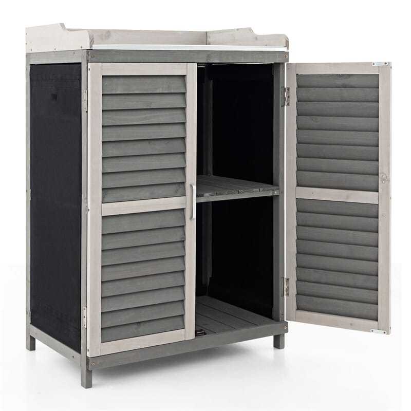 Outdoor Potting Bench Table Garden Storage Cabinet Solid Wood Potting Workstation with Metal Tabletop & Roll-up Side Door