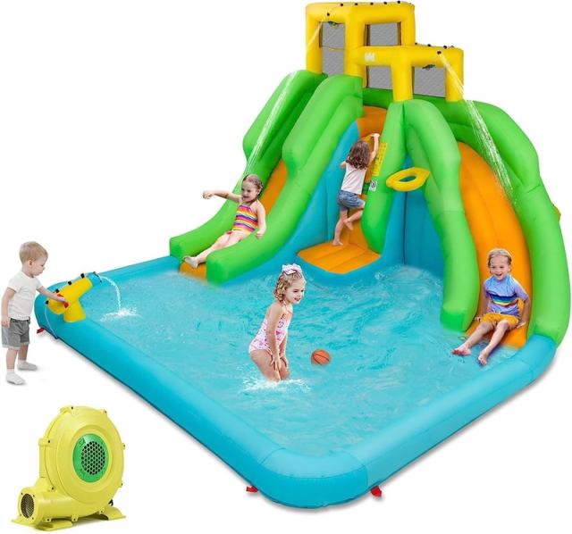 - Durable Materials & Safe Design: Crafted with high-quality 420D + 840D Oxford materials, this inflatable water park is waterproof and tear-resistant. Combined with double-reinforced sewing techniques, this inflatable water slide will bring continuous bounce to children. What's more, the jumping area is surrounded by mesh walls, which could ensure the safety of children while playing and allow for maximum ventilation. Besides, the included stakes add more stability to the castle. ASTM Certificated.