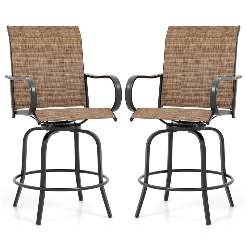 Outdoor Swivel Bar Stools Set of 2, All-Weather Steel Frame Bar Height Patio Chairs with Curved Armrests, High Back & Cozy Footrest