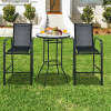This 3 pieces patio bar height bistro set will be an ideal choice for your outdoor places! Featuring an anti-rust steel frame and fast-drying fabric, this bar-height bistro furniture set can be enjoyed outdoors for many years. The breathable fabric, comfortable armrests, and considerate footrests give you a cozy sitting experience. And the heavy-duty steel frame with anti-slip foot pads provides a strong loading capacity. Additionally, maintenance is quite easy since the smooth tempered glass tabletop is convenient to clean.