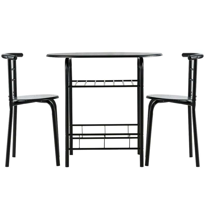No matter what size of your home space, this 3-piece wooden round space-saving bistro set will fit perfectly with your home! Thanks to its space-saving design, the 2 chairs of this dining table set can be pushed under the table to improve space utilization, which is perfect for compact space. Moreover, the large tabletop and built-in wine rack bring ample space to hold delicious foods, drinks, wine bottles, etc. Plus, ergonomic chairs with curved backrests allow you to sit cozily. And the thick MDF and rustproof steel frame are durable and stable for long time use. Meanwhile, both the table and chairs come with a strong loading capacity, which is enough for daily use.