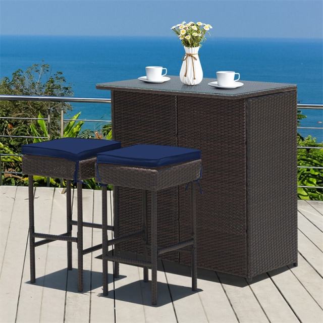3-Piece Patio Rattan Wicker Bar Table Stool Set with Seat Cushions & Glass Top Table