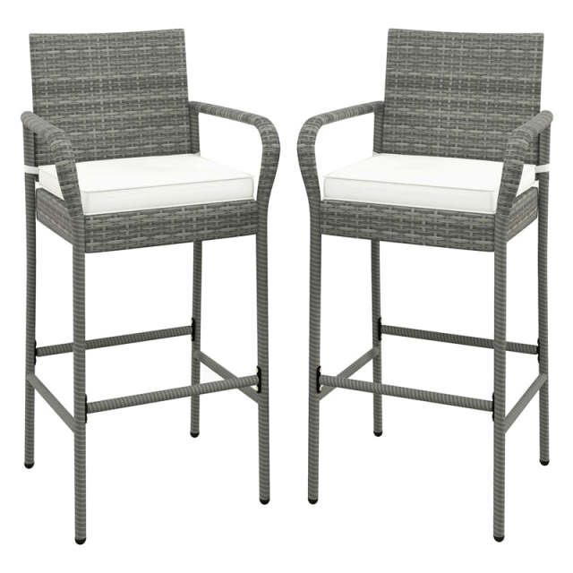 Have no suitable chairs for patio relaxation? Why not have a look at this rattan patio bar stool set of 4 with cushions? Consist of high-quality steel and weather-resistant PE rattan, these bar stools are suitable for outdoor use and will accompany you for a long-lasting time. And these stools are not only sturdy and durable but also of extra coziness. The high backrest, curved armrests, and footrests will relieve your fatigue and stress, and the high-density cushions for much softness. At the same time, these bar stools are available for many standard bar tables and can be used on various occasions, such as poolside, deck, and garden, making you fully enjoy chatting or dining with friends on these patio rattan bar stools. Taking the use longevity into consideration, please avoid prolonged exposure to extreme weather.