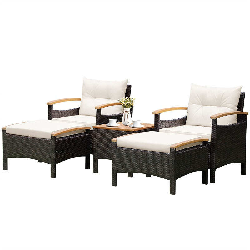5PCS Patio Rattan Furniture Set Outdoor Sofa Chairs Ottomans with Acacia Wood Top Table, Wicker Conversation Set w/ Seat & Back Cushions for Backyard