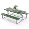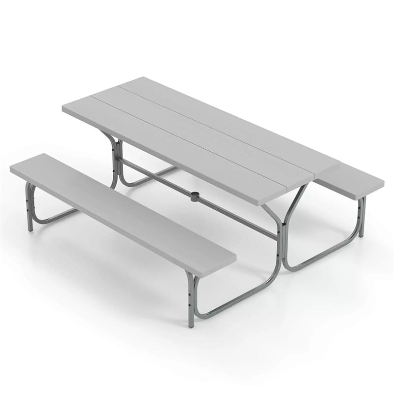 Perfect addition to your outdoor parties and activities! Our outdoor picnic table set with umbrella hole consists of a rectangular dining table and 2 benches. The picnic dining table measures 72" x 29" x 30" (L x W x H), and the bench measures 72" x 11.5" x 18" (L x W x H), providing a comfortable outdoor dining area with your family and friends. Compared to other wooden or metal tables, our HDPE tabletop is fade-resistant, weather-resistant, crack-resistant, and ultraviolet-resistant, lasting for years to come. And the heavy-duty powder-coated metal frame enhances overall sturdiness and stability. Not only that, the dining table is designed with a built-in umbrella hole (diameter: 1.9"), making it easy to insert an outdoor umbrella to enjoy a shady outdoor area. With its delicate wood-like texture and sleek lines, this stylish picnic table can also be a highlight to any indoor or outdoor space, such as living rooms, studies, balconies, offices, patios, poolsides, lawns, terraces, and more.