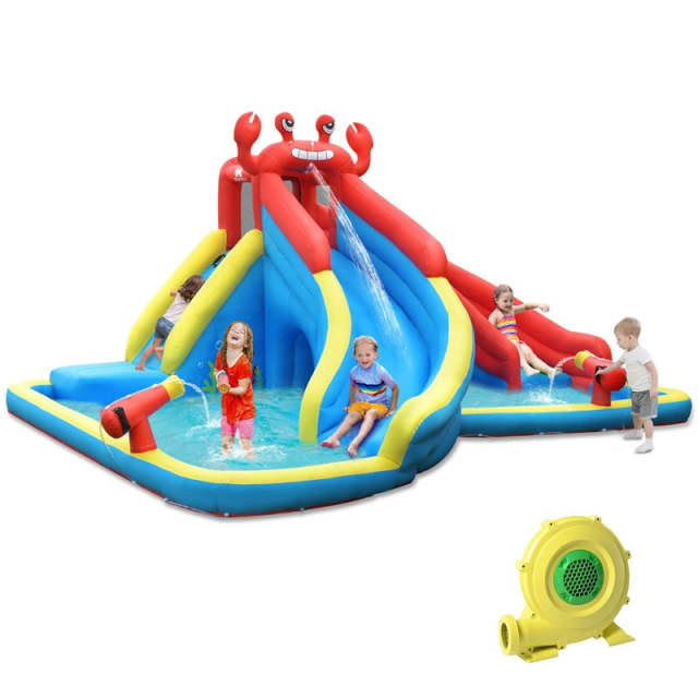 This ocean-themed bouncy castle will bring amusement park-like happiness to your children. The attached hose can turn the inflatable bounce house into a cool water park at any time. The surfing slide, large splash pool with water cannon, and ocean ball pool can provide more ways for your children to play. The inflatable castle water slide park is made of strong and durable PVC and Oxford cloth for a long service life. The enhanced slide handrails and ventilated safety mesh walls can protect children well when they play in the castle. Don't worry about inflating! The 735W air blower will help you complete the inflation quickly. The bouncy house water park can also improve your child's coordination and communication skills, allowing them to spend time in a healthier and more active way.