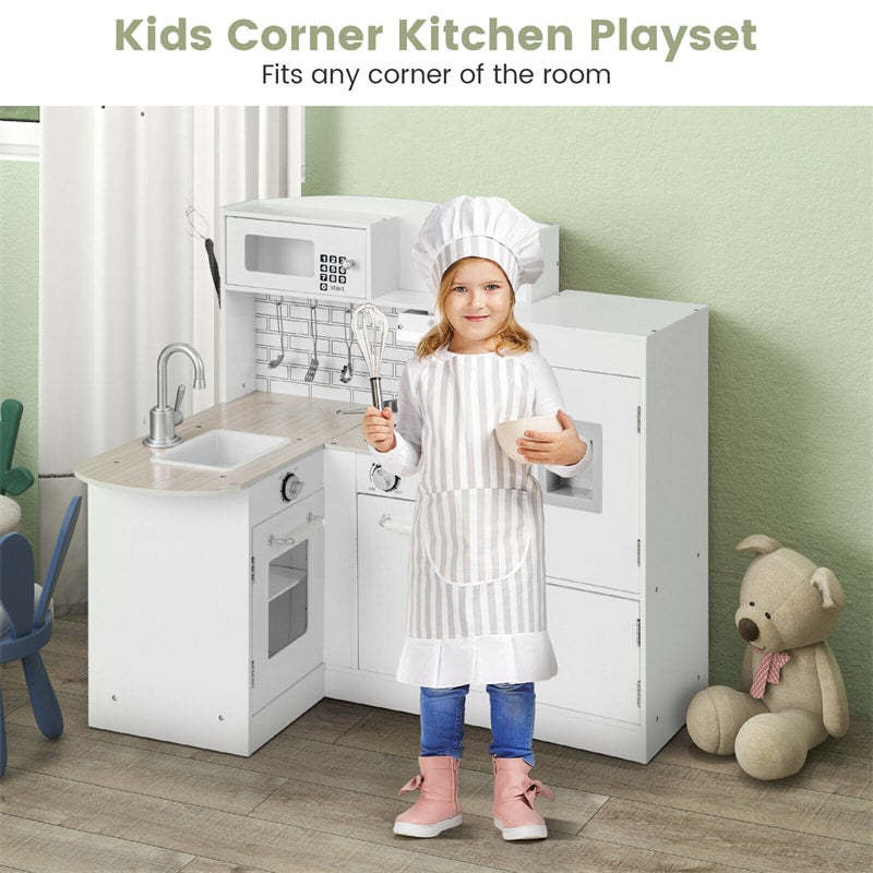Kids Corner Kitchen Playset 8-in-1 Little Chef Wooden Pretend Play Kitchen Modular Toy Kitchen with Refrigerator & Lights Sounds