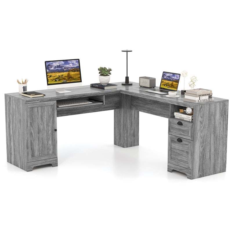- Large Work & Storage Space: A 66'' x 66'' L-shaped desktop provides ample space for your computer, monitor, and printer, 2 drawers, a cabinet, and an open shelf underneath offer extra room for convenient storing your office supplies, books, and so on. Adjustable shelf inside the cabinet for different sizes of items. A large file drawer is perfect for files of Letter size