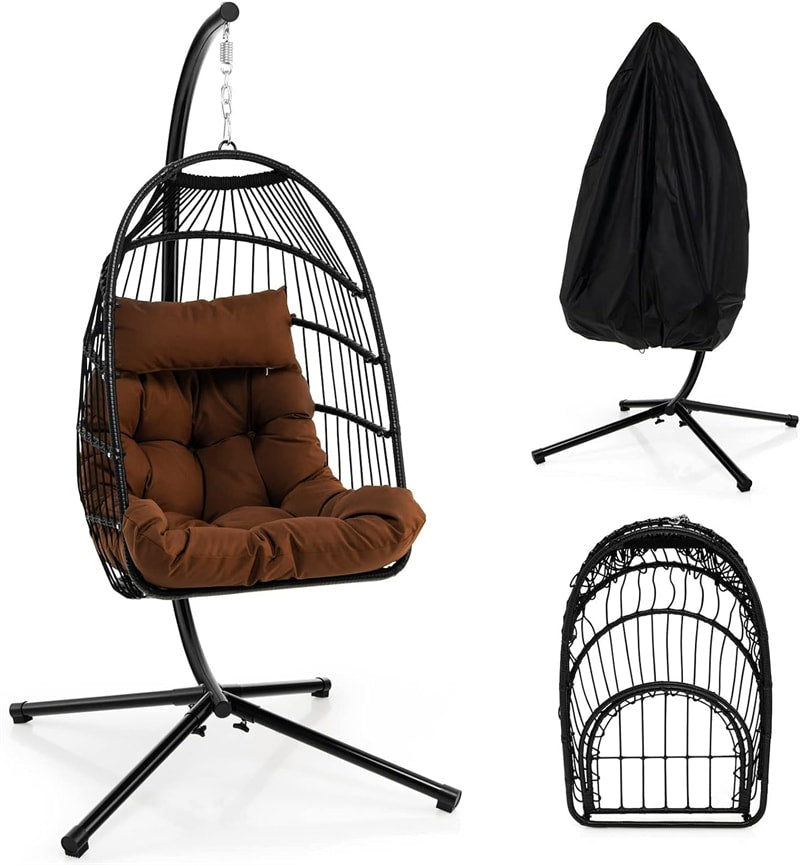 Swing Egg Chair Folding Hanging Basket Chair PE Rattan Hammock Chair with Steel Stand, Waterproof Cover, Removable Pillow & Cushion